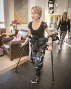 Exoskeletons used in combination with the Galileo whole body vibration technology, can reduce the risk of secondary complications as a consequence of paralysis, serve as a preventative healthcare measure, and enhance neuro-recovery. Efficiently using a powered exoskeleton in over-ground ambulation has the potential for physical health benefits and psychosocial benefits associated with weight bearing upright mobility. Functional gain and improved fitness are shown by: